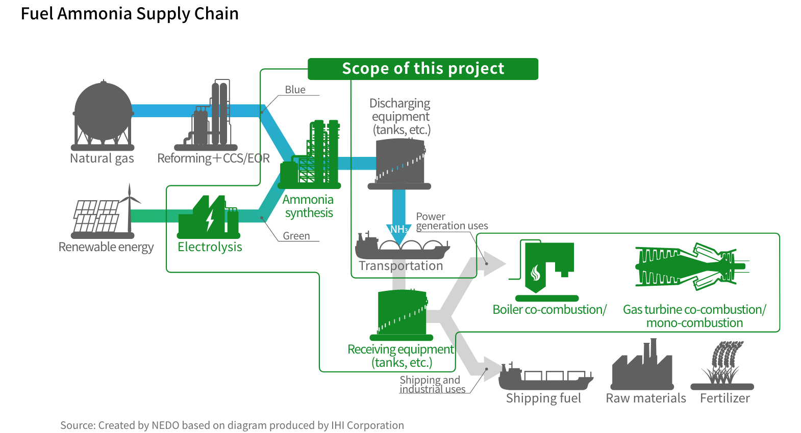 However, ammonia is not currently used as a fuel, so to realize a society where ammonia fuel can be used, various issues must be addressed, such as expanding its use, securing stable supply sources, and reducing its cost.