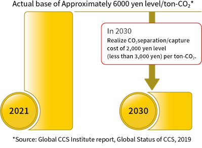 In 2030: Realize CO2 separation/capture cost of 2,000 yen level (less than 3,000 yen) per ton-CO2 for low-pressure, low-concentration gas (atmospheric pressure, CO2 concentrations no higher than 10%).