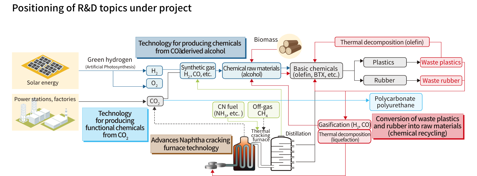 The aim of this project, therefore, is to develop four carbon recycling technologies related to the manufacture of plastic raw materials: advanced technology for naphtha cracking furnaces by adopting carbon-free heat sources, technology for producing chemicals from waste plastics and rubber, technology for producing functional chemicals from CO2, and technology for producing chemicals from alcohols.