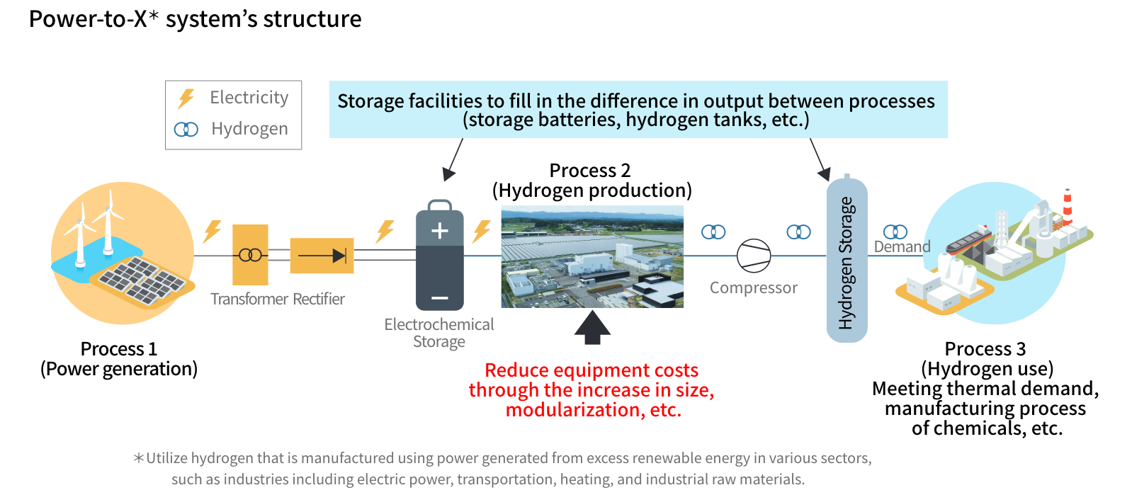 In order to realize technologies capable of reducing the cost of alkaline type and PEM type water electrolysers by 2030, R&D will take place on technology for increasing in size and modularizing scalable water electrolysers that can be mass produced, technology for mounting important components in water elecrolysers, such as membranes and catalysts, and technology for efficient system operation methods to replace fossil fuels and raw materials with hydrogen in industrial processes that use water electrolysers.