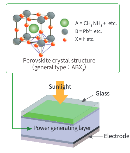 For perovskite solar cells, it is necessary to determine the optimum combination of raw materials from among tens of thousands of combinations, improve conversion efficiency, and improve durability for maintaining long-term performance. To create a market for such solar cell products, it is also necessary to develop and standardize methods for analyzing and evaluating battery performance and deterioration factors. R&D will therefore be carried out on the optimum material composition of perovskite solar cells, elemental technologies for batteries with high levels of conversion efficiency and durability, and analysis/evaluation techniques.