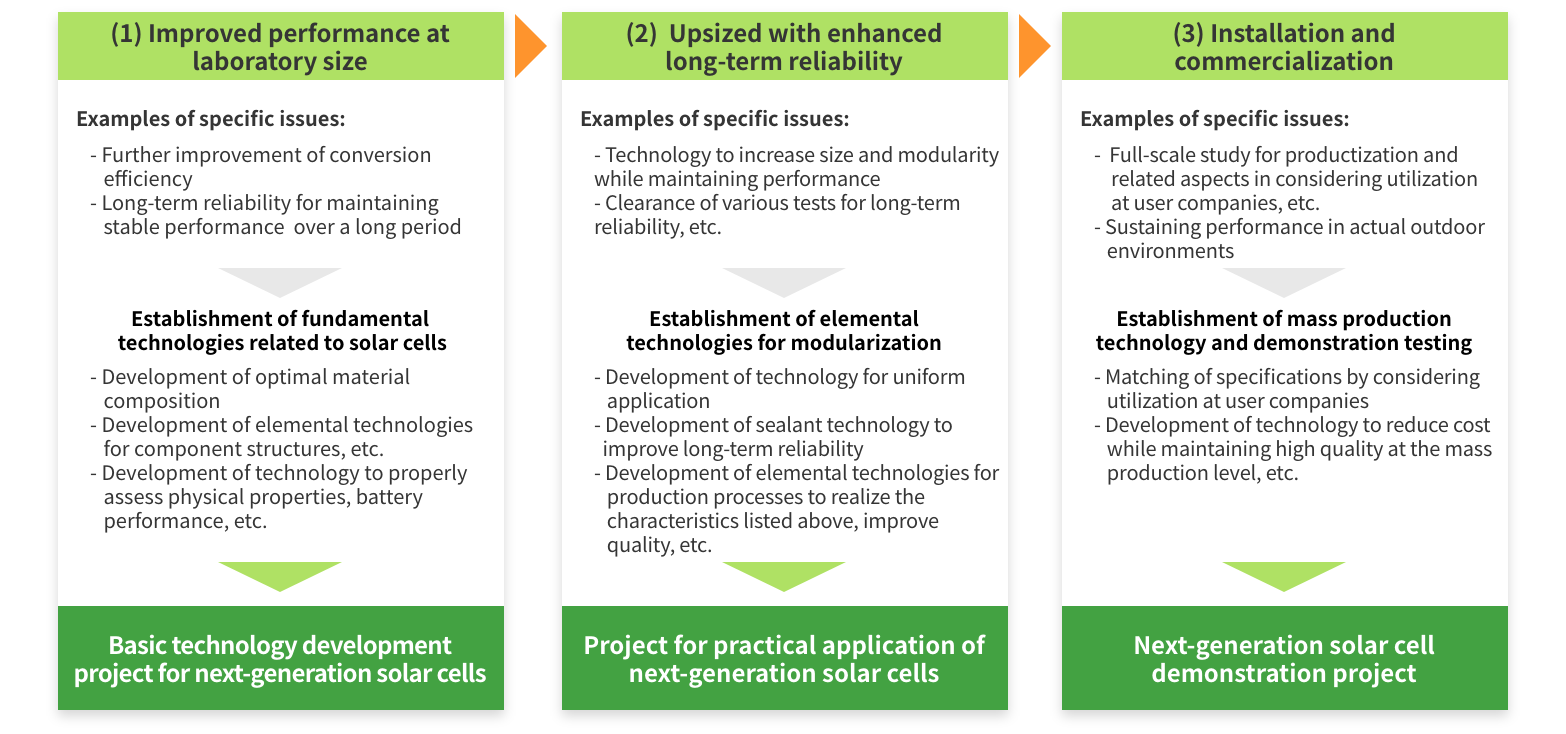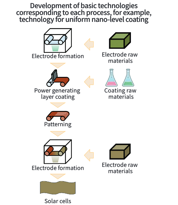 To realize perovskite solar cell modules that meet requirements related to the form of installation locations, conversion efficiency, durability, and power generation costs, in addition to utilizing basic technologies realized from the Basic technology development project for next-generation solar cells, R&D will be carried out for realizing elemental technologies for individual manufacturing processes (coating processes, electrode formation, and sealing processes) for scaling up products.