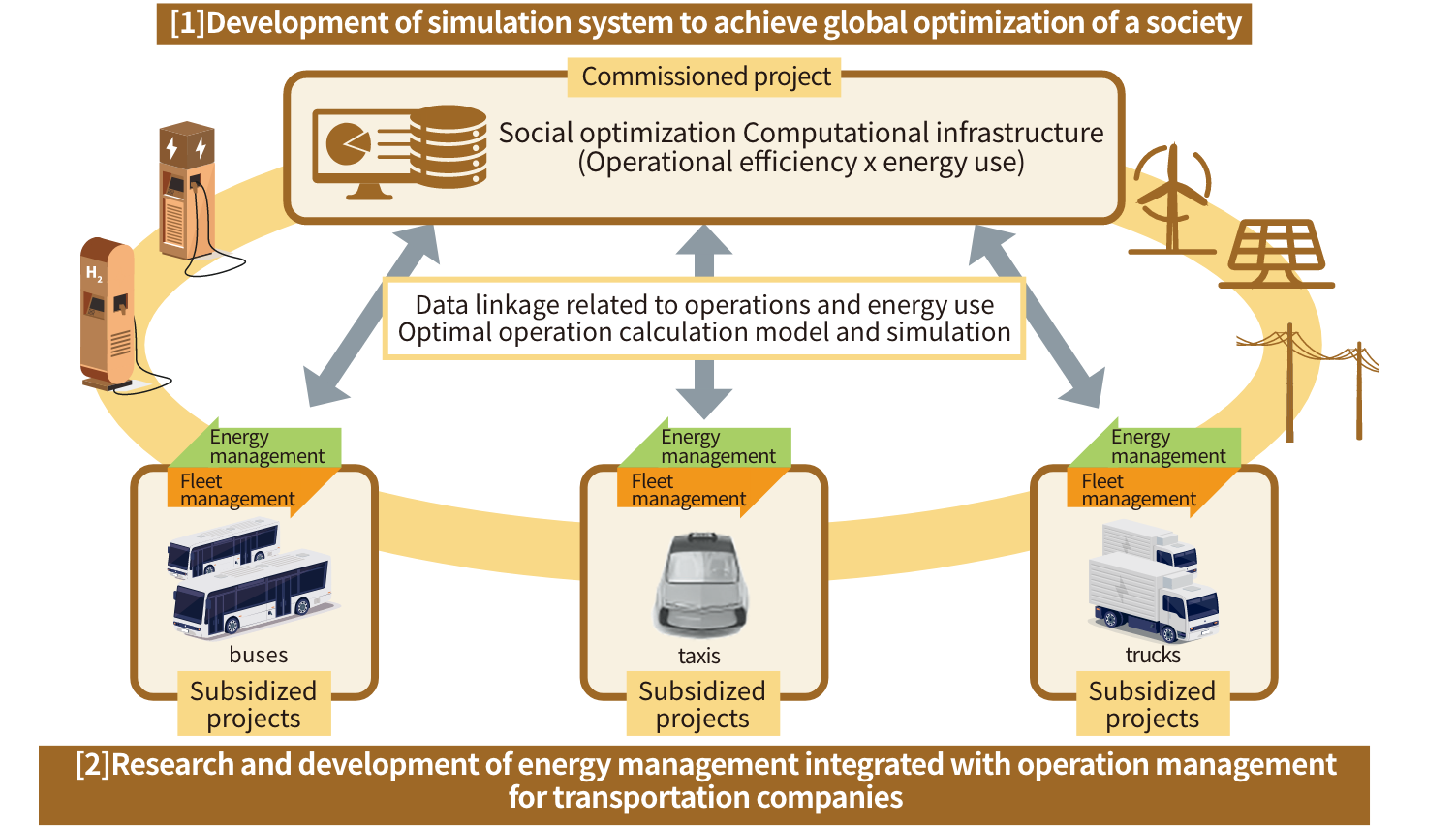 In anticipation of a time when commercial EVs are widely used, a simulation model for an integrated energy/fleet management system will be developed that optimizes energy consumption and results in lower CO₂ emissions by reducing loads on energy systems and identifying the most suitable layouts for charging and hydrogen fueling infrastructures. Also, analyses will be conducted to ensure that the model can be utilized by companies in the transportation sector.