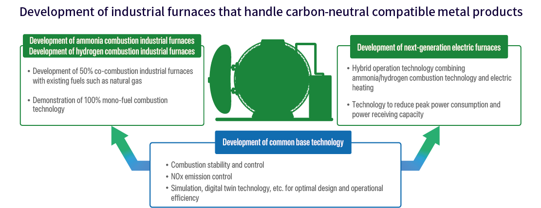 This project will develop technologies for combustion furnaces compatible with ammonia and hydrogen fuels, etc., and for minimizing and increasing the efficiency of electric furnace receiving capacity, which is essential for promoting the transition from combustion to electric furnaces, with a view to establishing a supply base for zero-emission fuels in the future.