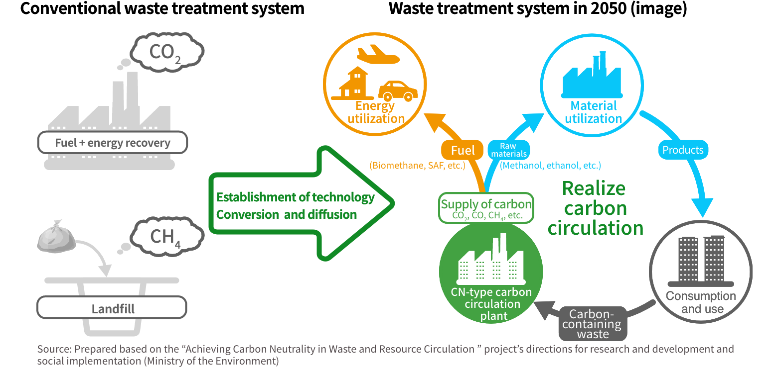 Waste has become a problem due to CO2 emissions from incineration of plastics and other materials and methane emissions from landfill disposal of organic waste, and in order to achieve carbon neutrality, it is essential to recover carbon from waste and circulate it in society as raw materials and fuels.