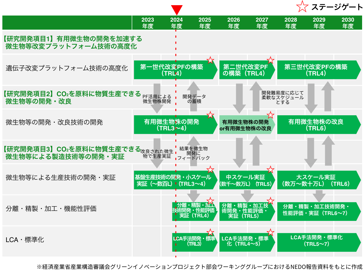 - CO2を原料に物質生産を行う独立栄養微生物として、各コンソーシアムでそれぞれ、①水素酸化細菌( CO2 、H2 、O2を利用)、②CO資化菌( COを利用) 、③微細藻類( 光合成を利用) の3種類について開発中。水素酸化細菌とCO資化菌では安全で効率的な「ガス発酵」技術について、藻類では独自の培養技術(フォトバイオリアクター)について、大規模実証を実施予定。