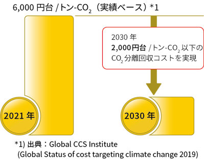 2030年:低圧・低濃度ガス(大気圧、CO2濃度10%以下)に対して、2,000円台/トン-CO2以下のCO2分離回収コストを実現