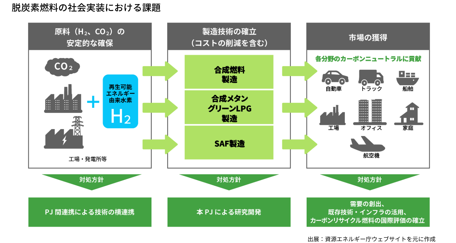 脱炭素社会の実現に向けた多様な選択肢の一つとして、カーボンリサイクル燃料の技術開発を促進することが必要であり、本プロジェクトでは、液体燃料として①合成燃料、②持続可能な航空燃料(SAF)を、気体燃料として③合成メタン、④グリーンLPGについて、社会実装に向けた取組を行います。