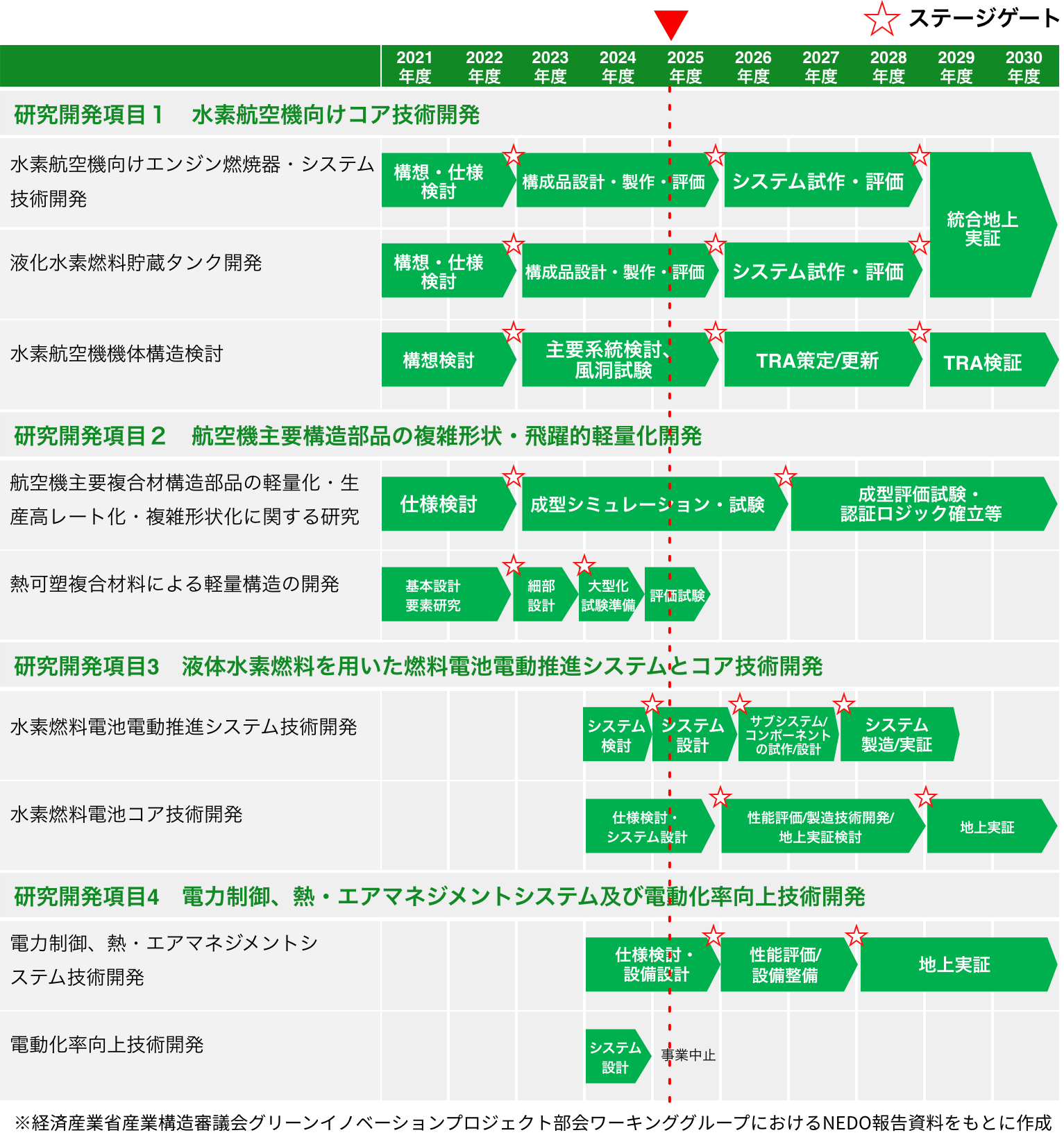 - 「水素燃料電池電動推進システム技術開発」では、2024年度実施のステージゲート審査にて継続判断。目標性能達成のための複数のシステム案を検討し、実現に向けた技術課題を抽出。