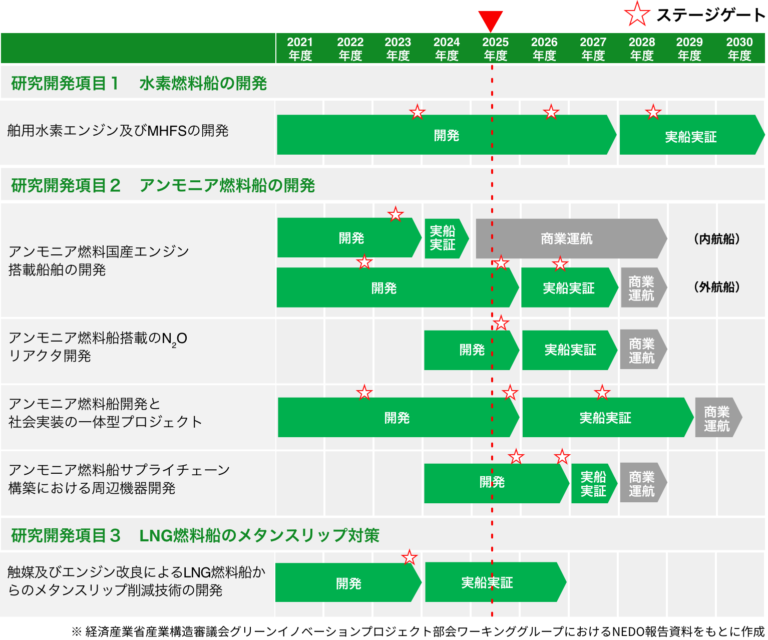 - アンモニア燃料船開発と社会実装の一体型プロジェクトは、助成対象外である海外エンジンメーカの開発遅れにより、実船実証の開始が1年以上遅れる見通し。