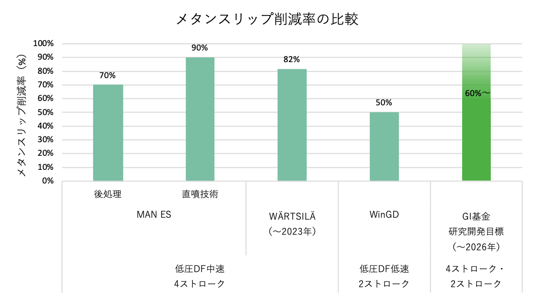 - WinGD:低速DF低速2ストロークエンジン(IMOによる代表値2.5g/kWh)において、メタンスリップ削減を50%実現する見通し。