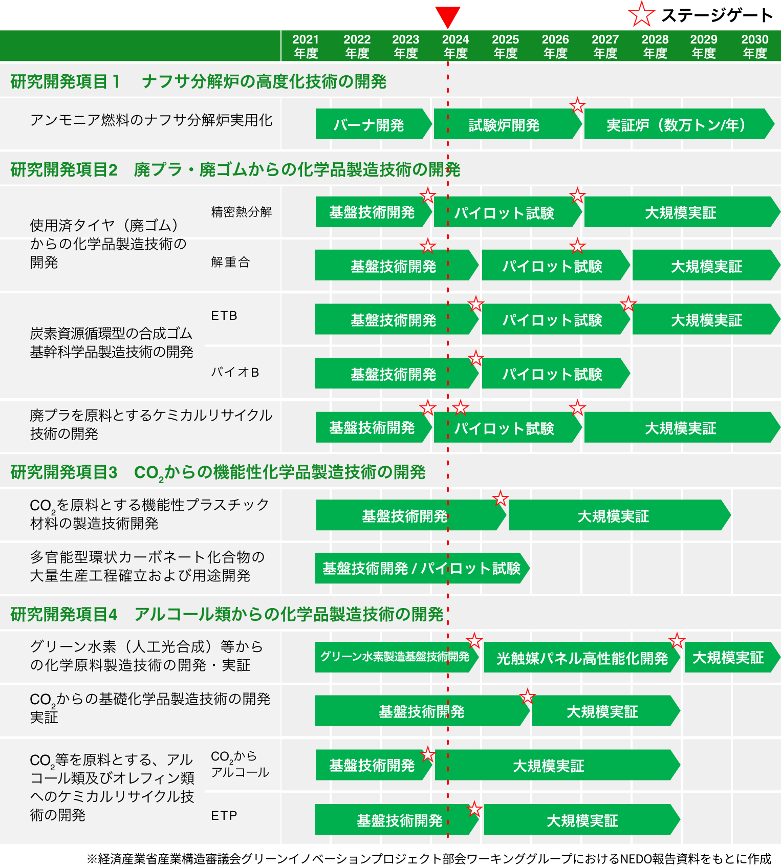 「CO2からの基礎化学品製造技術の開発・実証」では、メタノール合成にて触媒および分離膜開発に目途が立ち一体化での検討を開始、MTOプロセス開発にて触媒コスト低減と性能改善を達成し実証試験に向けての準備を進行中。 - 「CO2等を原料とする、アルコール類及びオレフィン類へのケミカルリサイクル技術の開発」では、メタノールにてベンチ機での目標収率を達成しパイロット機運転開始、オレフィン製造ではエタノールからプロピレンの収率向上を確認しパイロット機建設中。