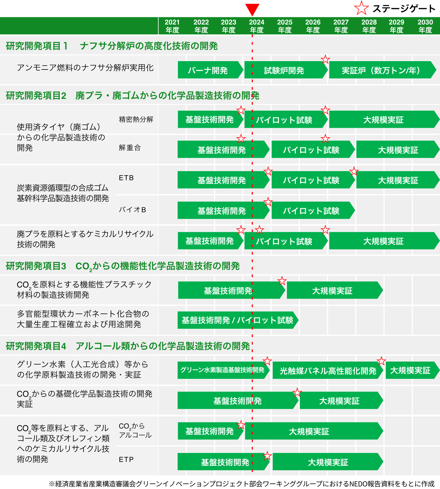 - 「アンモニア燃料のナフサ分解炉実用化」では、アンモニアバーナーにて目標NOx値達成、試験炉の基本設計を完了し詳細設計を進行中。