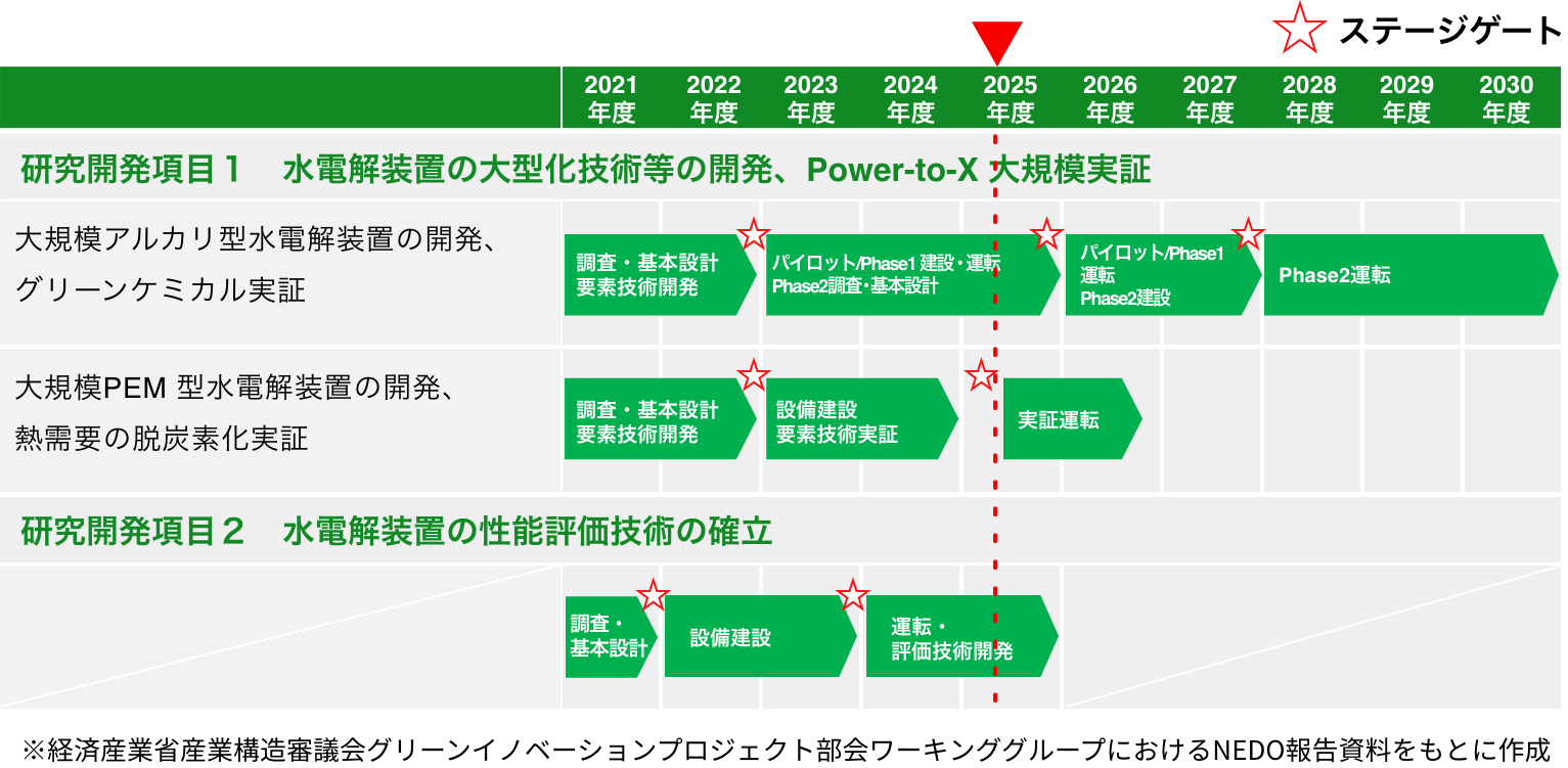 - 「大規模アルカリ型水電解装置の開発、グリーンケミカル実証」では、Phase1(浪江アンモニアプラント)で一部機器の納入が遅延、Phase2で海外実証地の見直しとなったが、全体スケジュールは巻き返し可能な見込み。