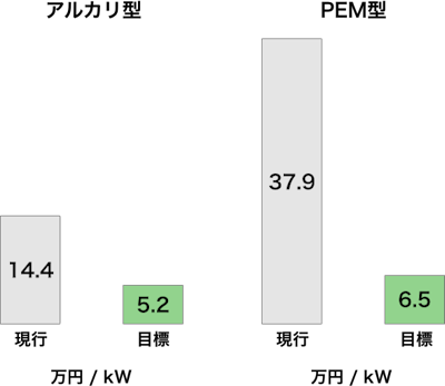 2030年: アルカリ型5.2万円/kW・PEM型6.5万円/kW