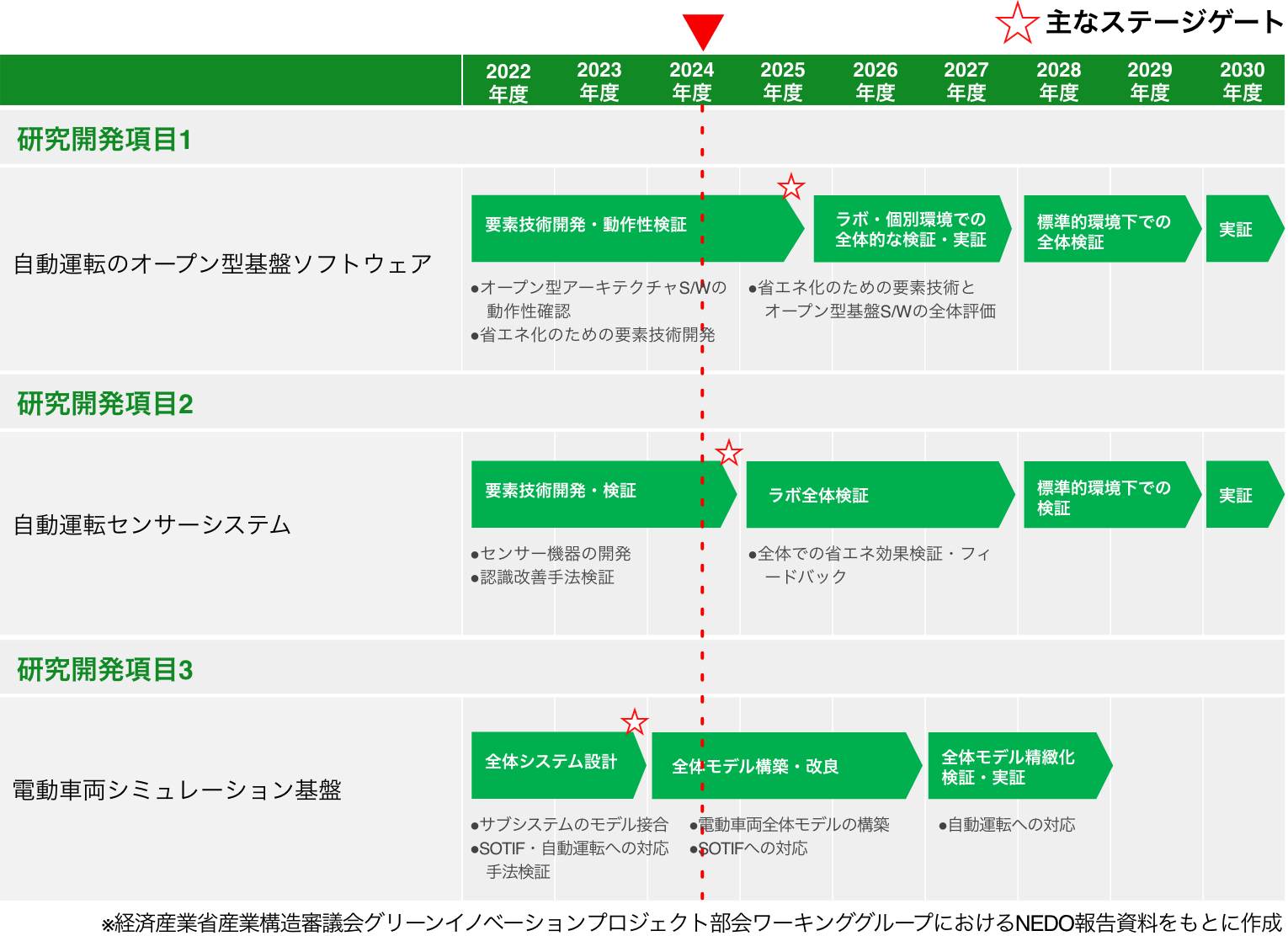 - 「自動運転のオープン型基盤ソフトウェア」では、オープンソースソフトウェア「Autoware」をベースとした自動運転システムのリファレンスデザインを用いて、機能拡張や性能適合、運行管理、保守のためのソフトウェアプラットフォームを開発中。