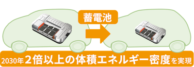 - 2030年に、車載用として求められる性能・サイズ等の水準のパックで、①体積エネルギー密度700~800Wh/L以上となる蓄電池(例えば全固体電池)、又は②出力密度が2,000〜2,500W/kg以上、かつ、体積エネルギー密度が200~300Wh/L以上となる蓄電池の実現を見通せる技術やその実現に資する材料技術を開発