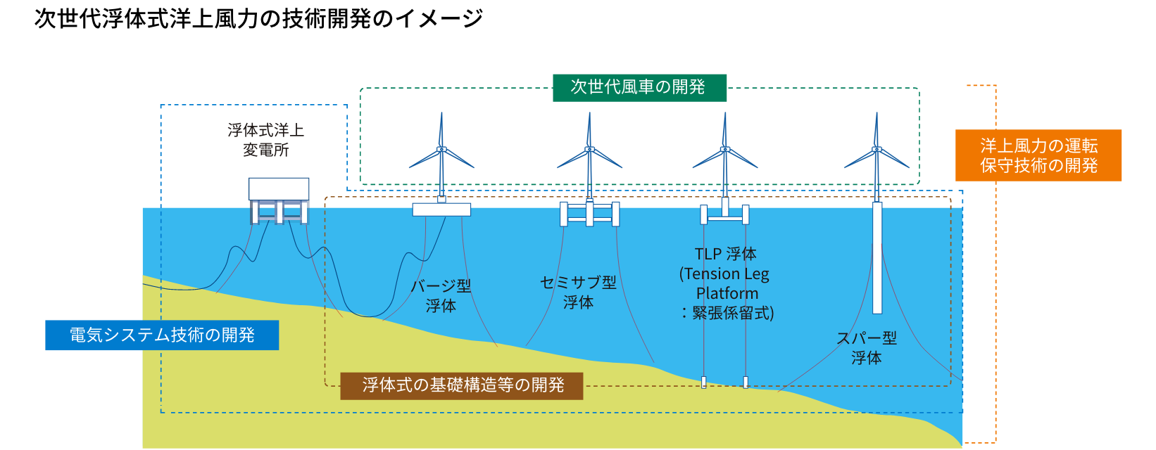 浮体システムの最適な設計規準・規格化、浮体基礎の大量・高速製造技術の開発、大水深に対応する係留や電気システム等。