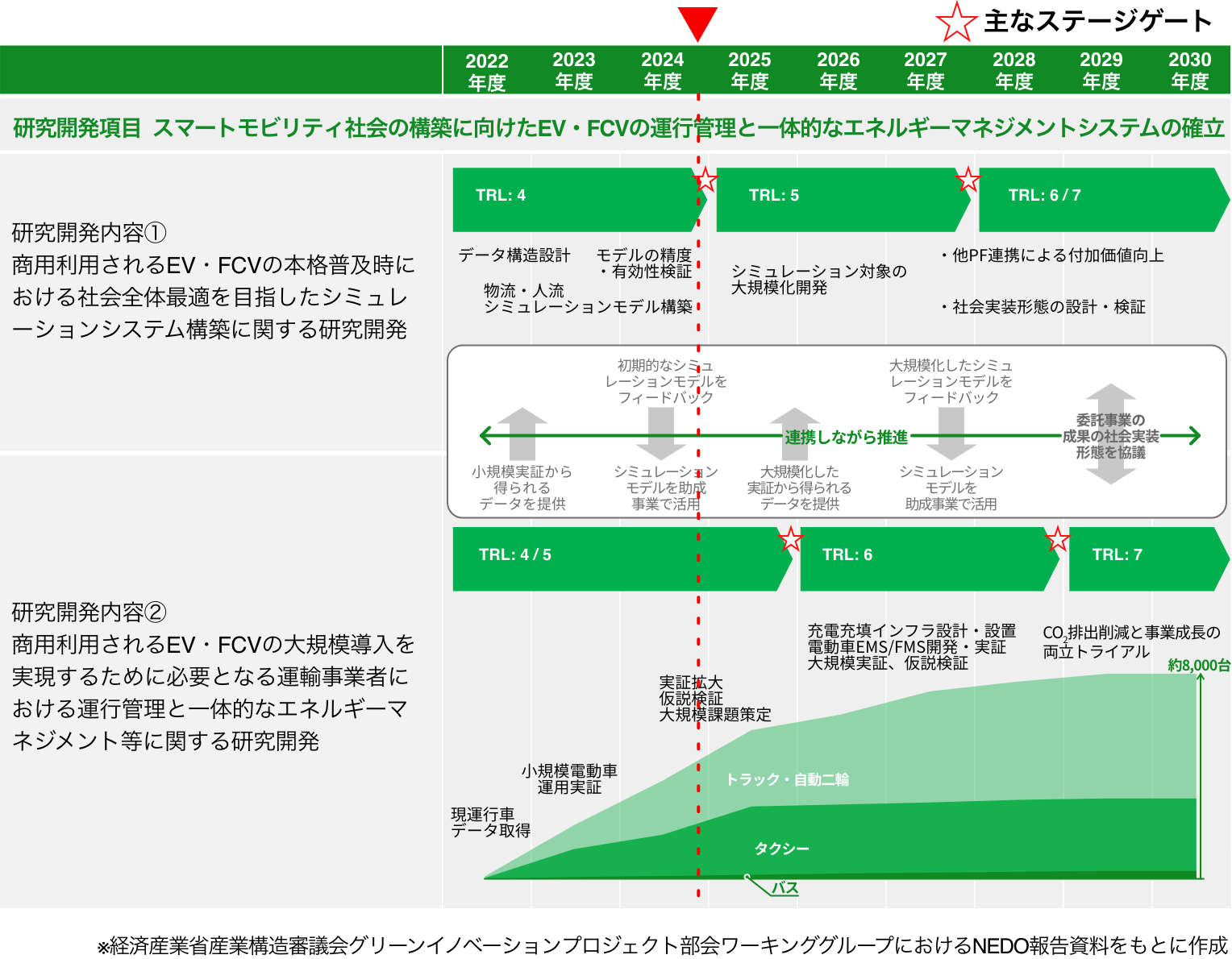 - 各事業において電動車両の導入が進む中、状況変化を適宜把握しそれに応じて計画の見直しを行うとともに、運行管理・エネルギーマネジメントシステムの基盤構築・システム開発・課題検証を推進。