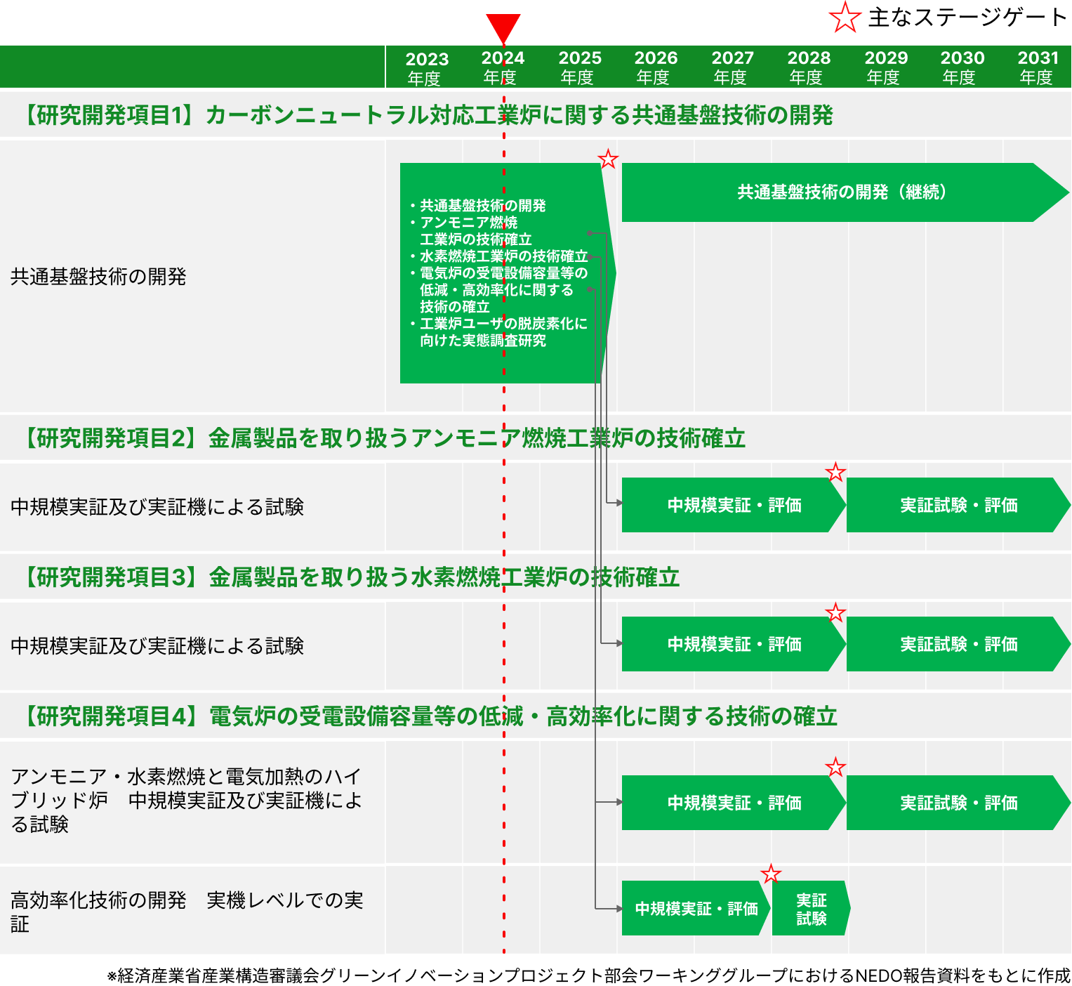 - 研究開発項目1「共通基盤技術の開発」を技術研究組合(DITS)へ委託し研究開発を推進。DITSは工業炉メーカー・工業炉ユーザー・大学・国研、計36分室からなるコンソーシアムを組成。素形材産業の金属加工で使用される工業炉を対象に水素・アンモニア燃焼および電化によるカーボンニュートラル工業炉の開発を目指し、研究開発は概ね計画通り進捗。