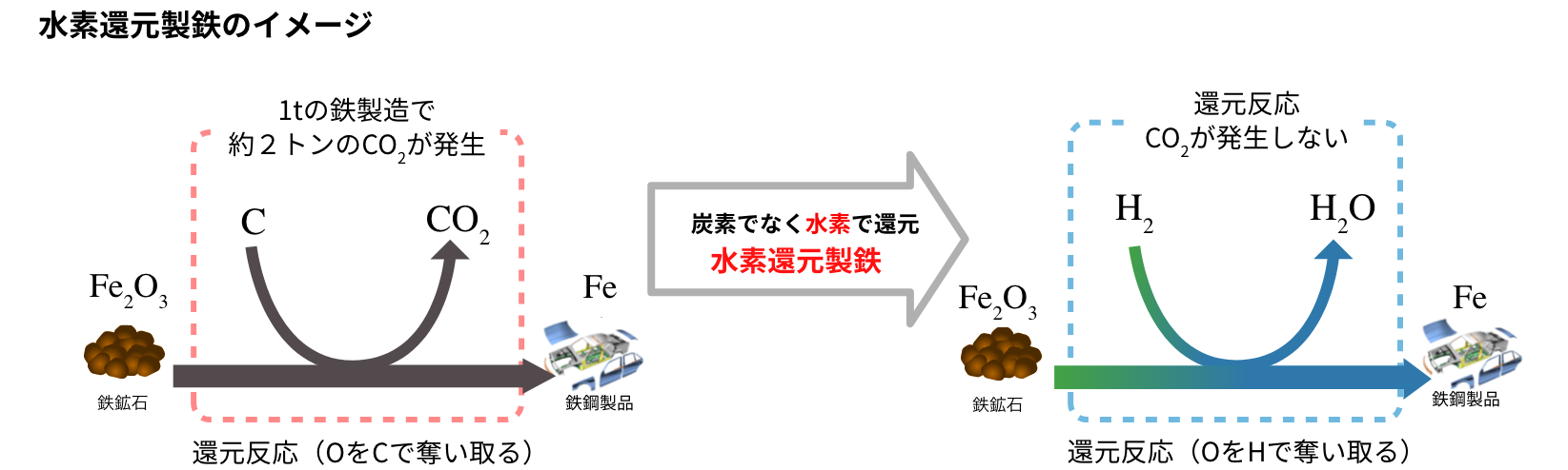 鉄鋼の製造にあたっては、古来より炭素(木炭や石炭)を用いて鉄鉱石を還元する方法が主に用いられてきましたが、この方法ではCO2の発生が避けられないため、CO2の排出を削減するためには、原料や還元剤として石炭を使用することから脱却するという、製鉄プロセスの抜本的な転換が求められています。このため、鉄鉱石の還元に「炭素」ではなく「水素」を用いる水素還元製鉄の研究が世界各国で進められていますが、未だ実用化はされておりません。