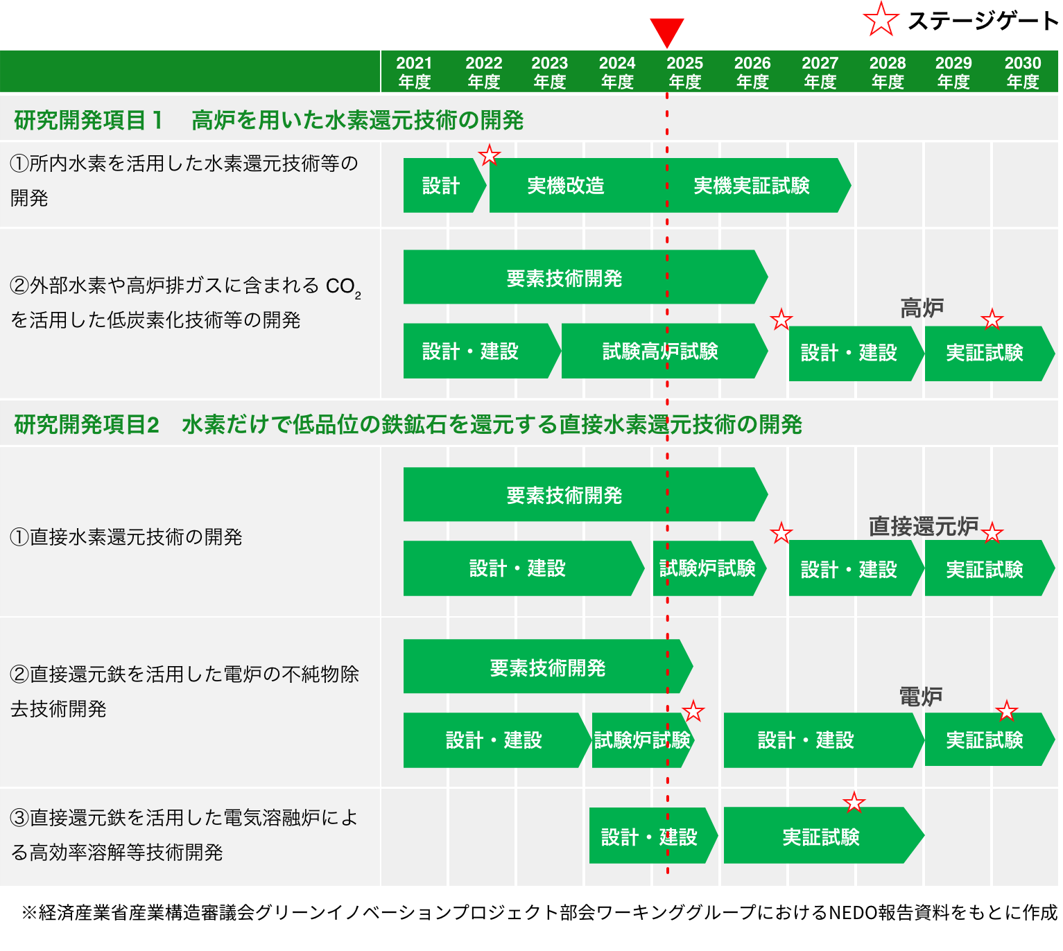 - 「直接還元鉄を活用した電気溶融炉による高効率溶解等技術開発」については、新規に項目を追加。試験設備仕様等を検討中。