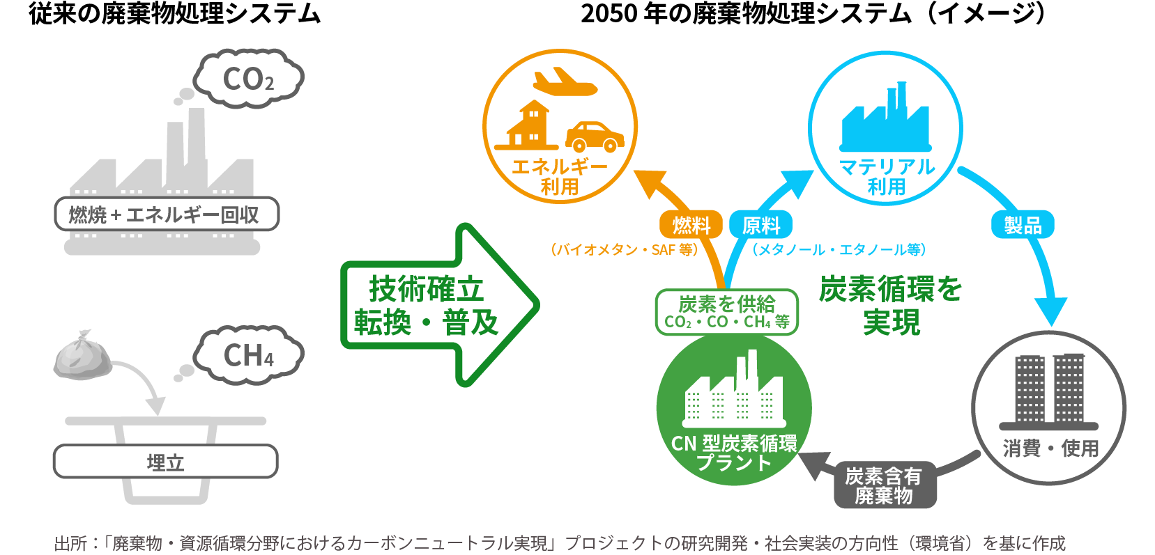 廃棄物は、プラスチック等の焼却によるCO2放出や、有機性廃棄物の埋立処分によるメタンの放出などが問題となっており、カーボンニュートラル実現のためには、廃棄物から炭素を回収して、原料や燃料として社会に循環させることが必要不可欠です。